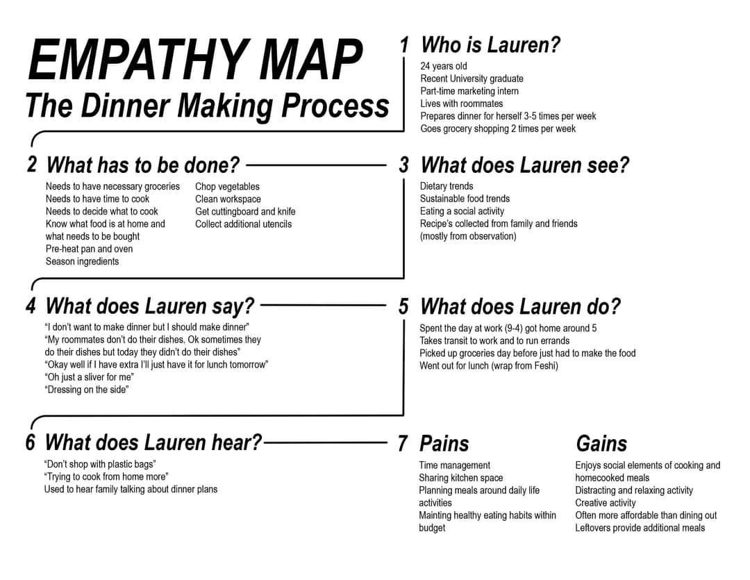 This is an example of an empathy map. They are a research tool used to help ︎︎︎better understand the flow of an experience︎︎︎ by observing how someone behaves and acts. They explore the task itself and the points where the user makes decisions, and why they made them. It is helpful for the designer to be able to imagine going through this process and to design with that empathic experience in mindHow Do You Order On Uber Eats?![]()